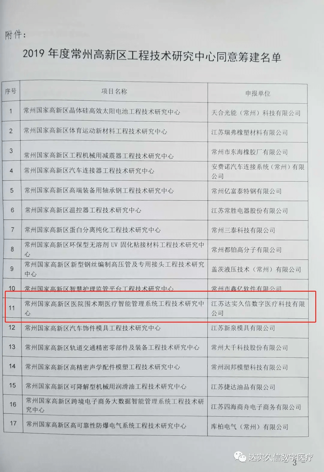 日前,常州國(guó)家高新區(qū)科學(xué)技術(shù)局發(fā)布2019年度工程技術(shù)研究中心名單,由江蘇達(dá)實(shí)久信數(shù)字醫(yī)療科技有限公司籌建的“常州國(guó)家高新區(qū)醫(yī)院圍術(shù)期醫(yī)療智慧管理系統(tǒng)工程技術(shù)研究中心”位列其中。